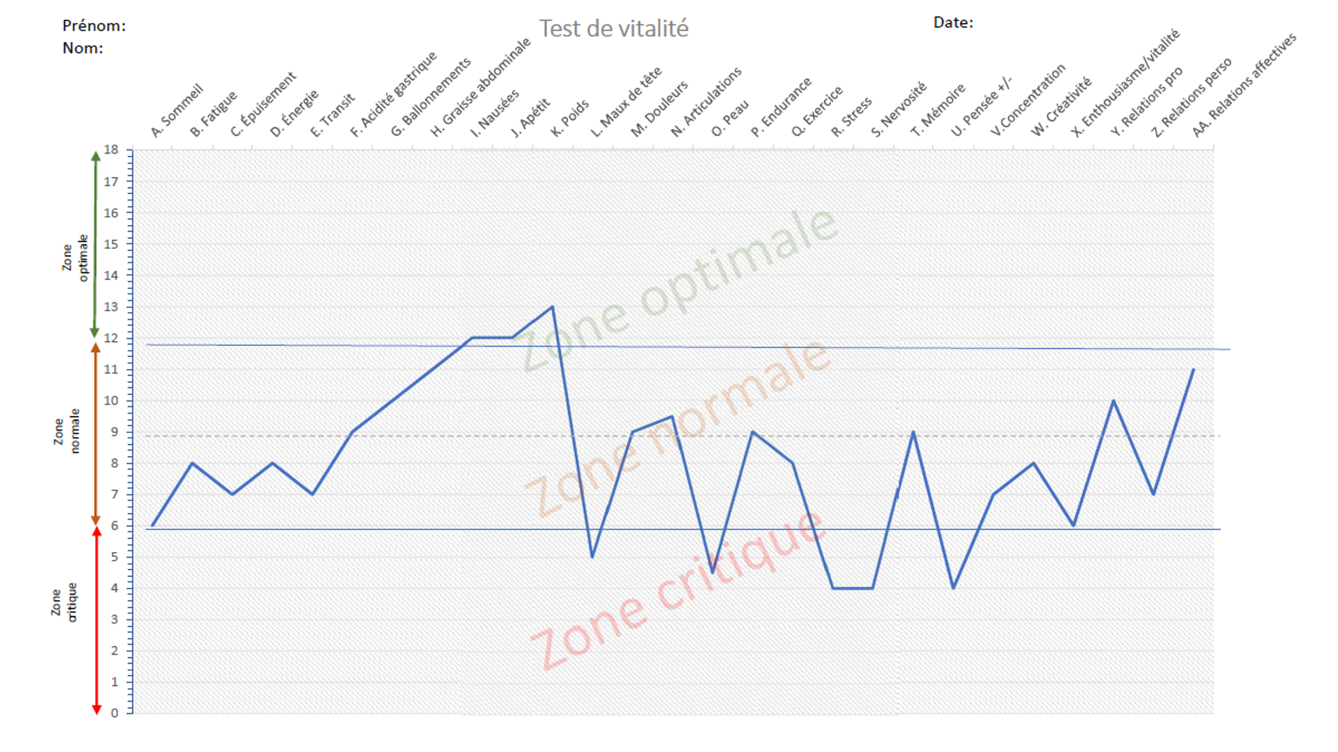 Grâce à un questionnaire précis et à sa représentation graphique, le test révèle le degré d’interférence des toxines sur les fonctions biochimiques de l’organisme. Il peut être utilisé aussi bien comme indicateur de départ que comme un moyen de mesurer les améliorations obtenues au fil du programme.